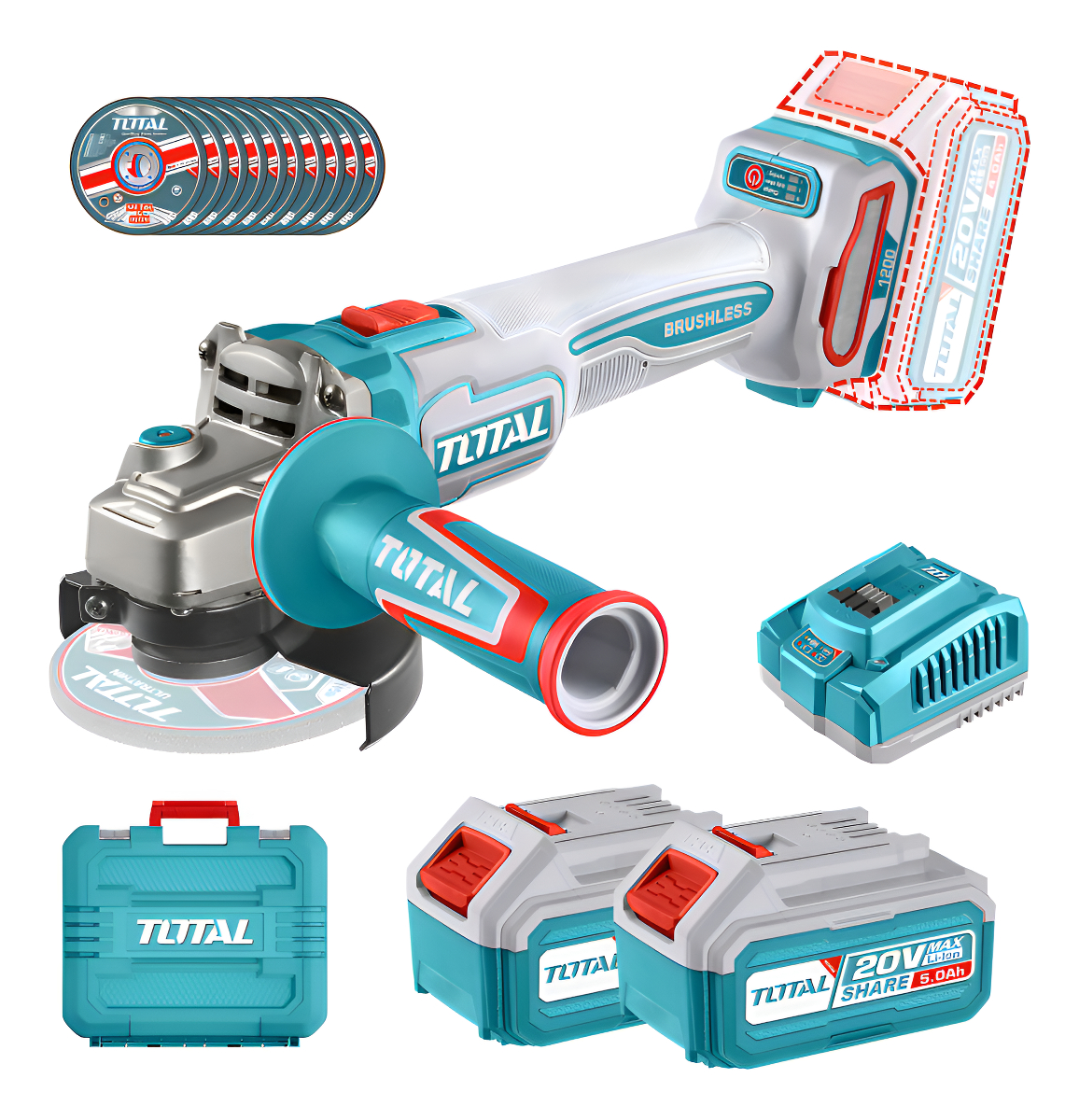 Incluye 2 baterías de 5.0Ah, cargador rápido, 10 discos de corte y maletín.