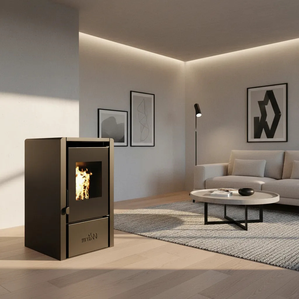 6. LCD panel de control: se coloca en el lado superior de la estufa, simple y fácil de utilizar. Es posible planificar el cambio semanal de encendido y apagado de la estufa (fin de semana incluido).