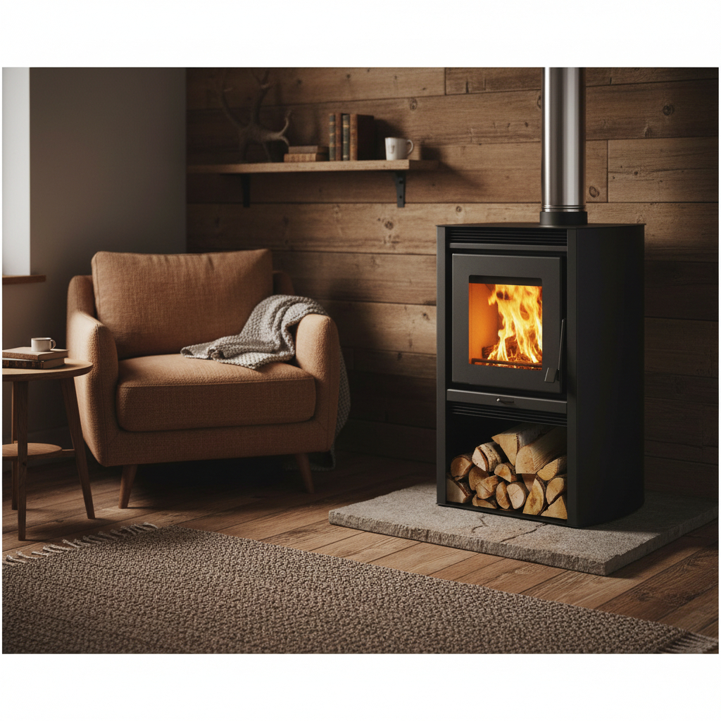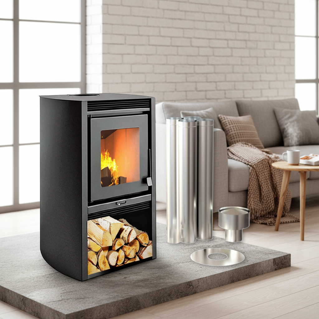 Calefactor a leña ecológico doble combustión + Kit instalación en acero inoxidable.