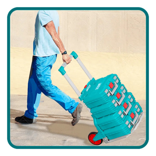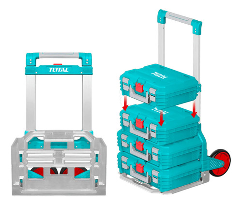 Las cajas de herramientas apilables de 16″ (TPBXS101), 19″ (TPBXS102) y 19″ (TPBXS103) se pueden apilar en el carro plegable para facilitar su transporte.