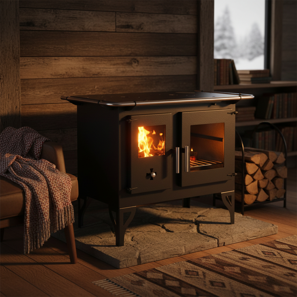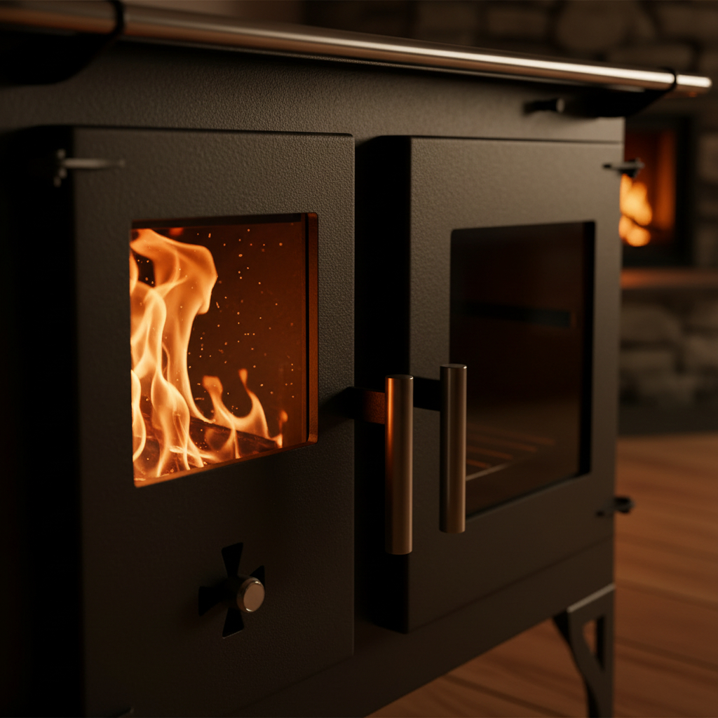 Estufa de leña, construida en acero al carbono con diseño innovador y sistema de doble combustión.