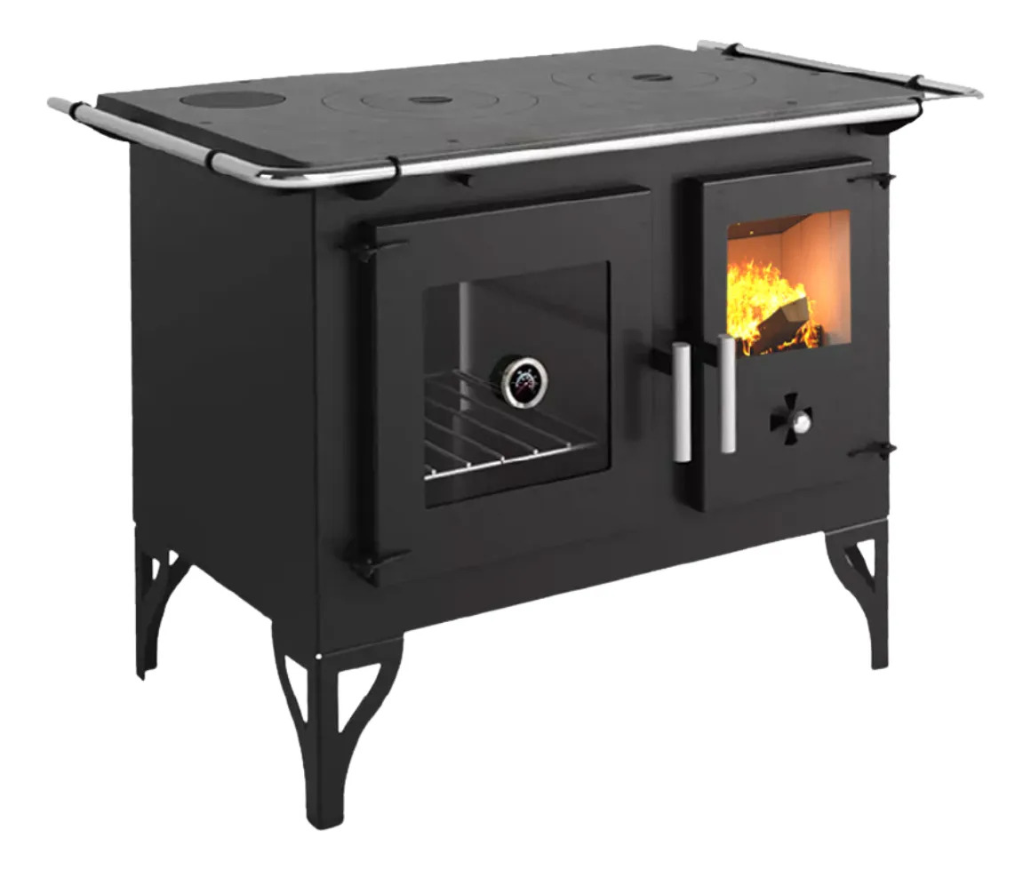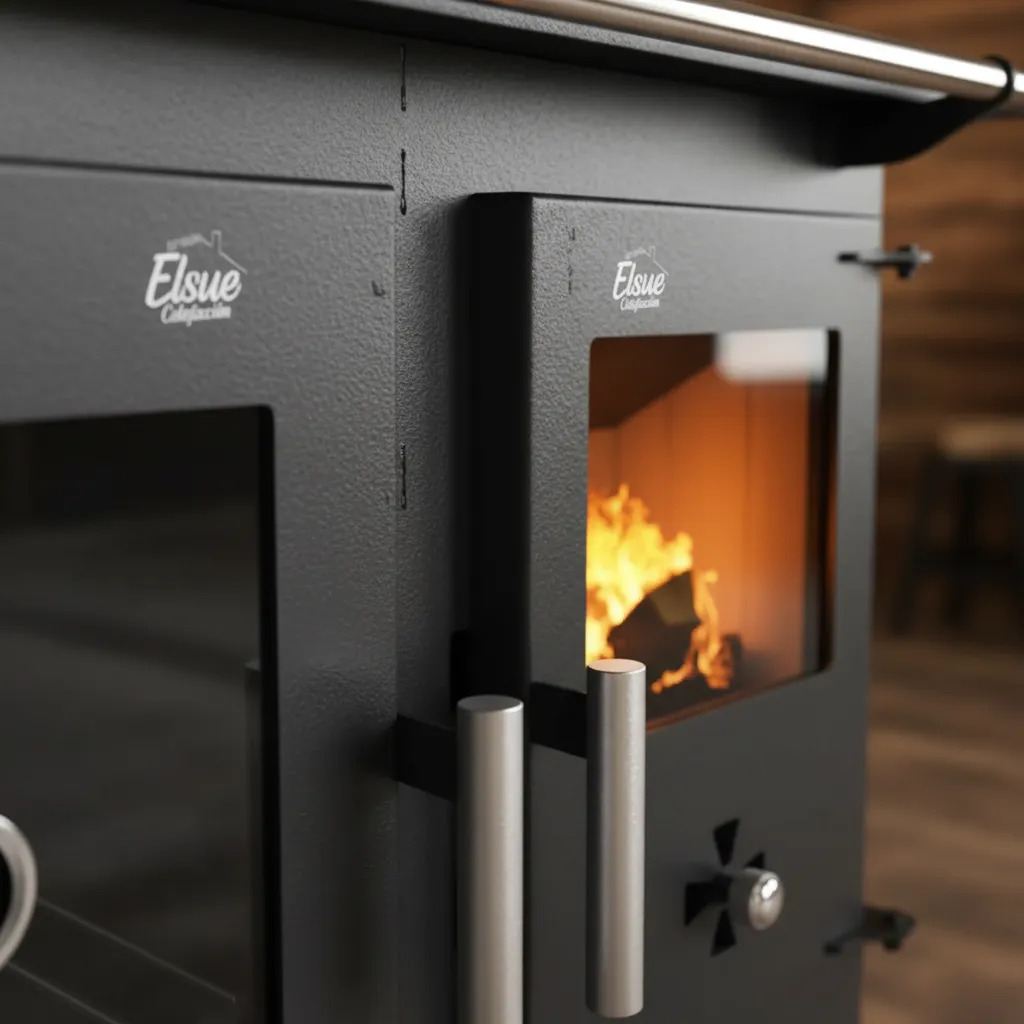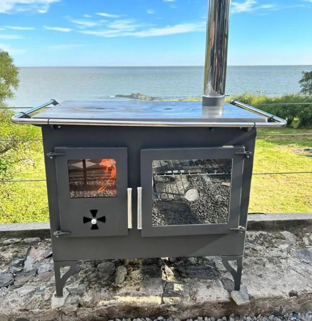 Estufa de leña, construida en acero al carbono con diseño innovador y sistema de doble combustión.