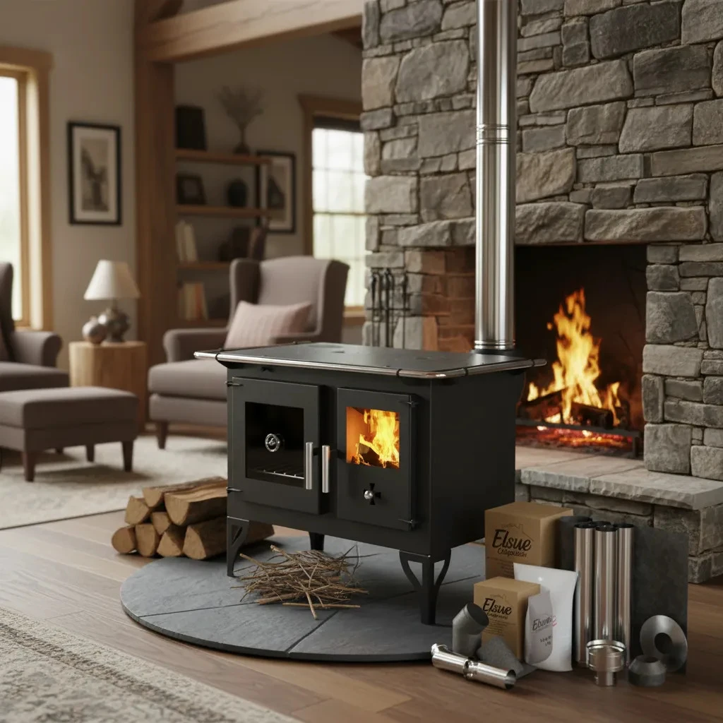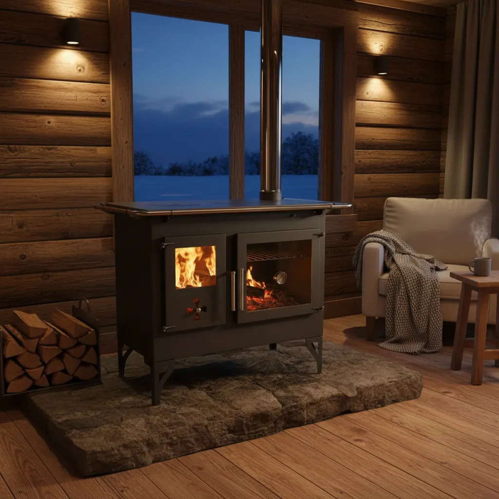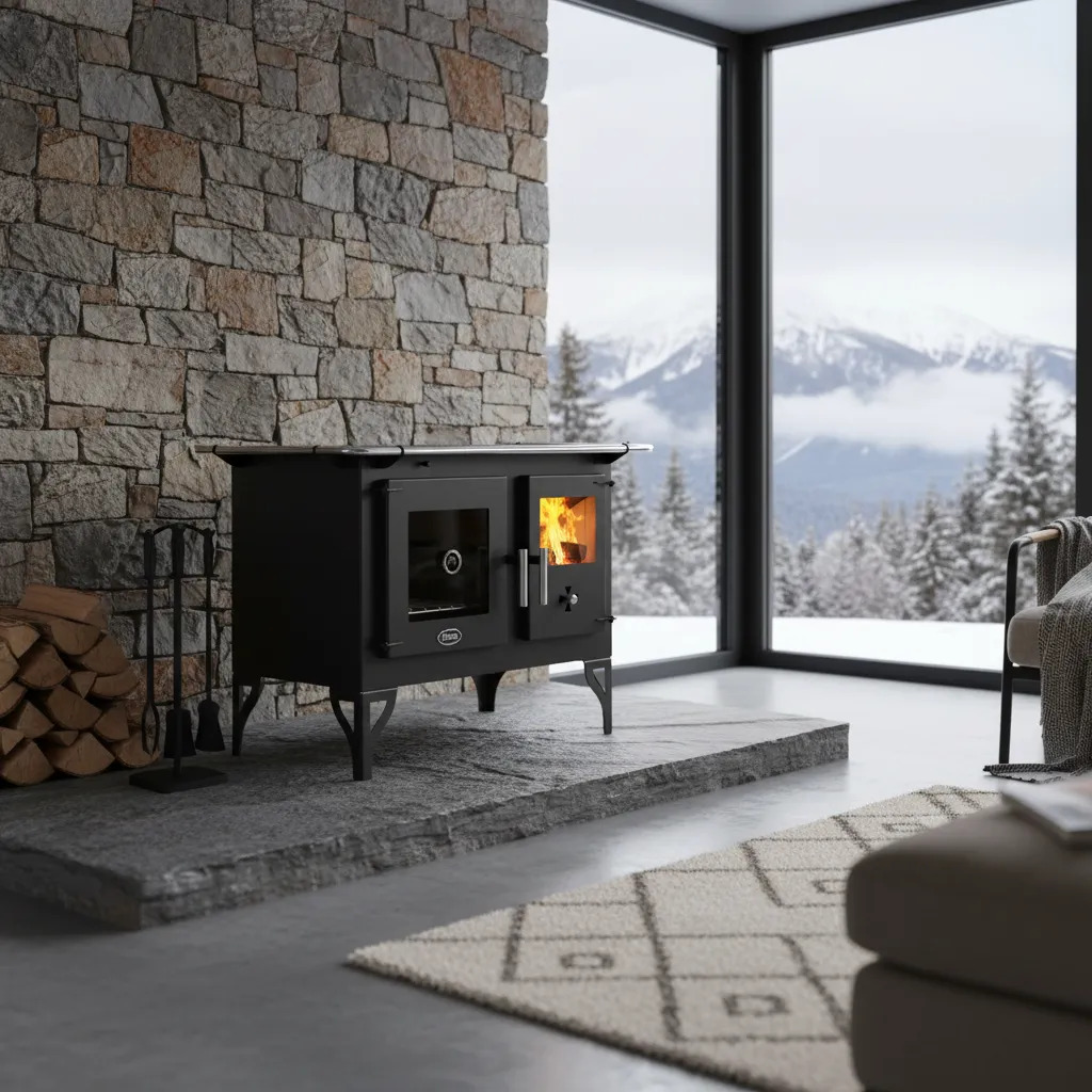 Estufa de leña, construida en acero al carbono con diseño innovador y sistema de doble combustión.