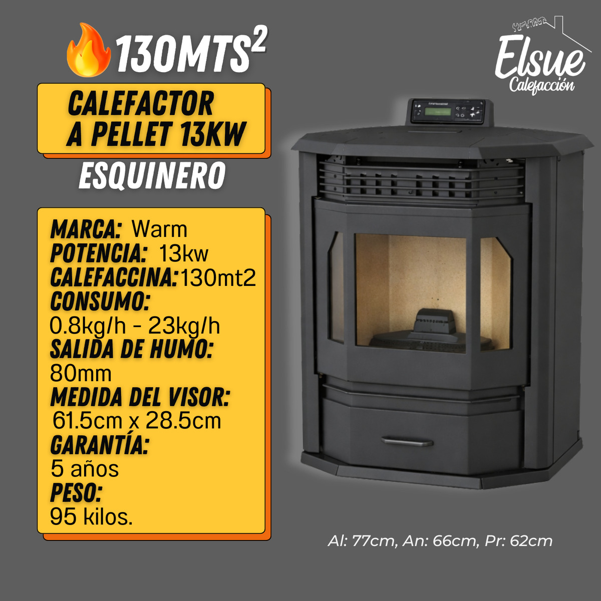CALEFACTOR A PELLET ESQUINERO WARM 13KW – 130MT2 (NO INCLUYE KIT DE CAÑOS)