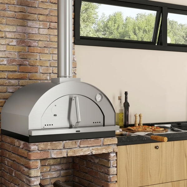 El Horno para Pizza Mediano Firenze Firenze de Metávila tiene un diseño italiano, formato iglú para uso interior, debe instalarse fijo sobre una encimera resistente a la temperatura. Fabricado en acero inoxidable cepillado, es el producto que faltaba para integrar tu zona Gourmet y hacer feliz a la familia. Haz pizzas, carnes, panes y pasteles con sabor a horno de leña sin salir de casa. El horno de leña para pizza Firenze Firenze en acero inoxidable cepillado 615IN viene con conductos y acabado de revestimiento también en acero inoxidable cepillado.
