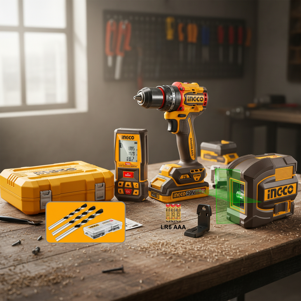 KIT COMBO P20S 20V TALADRO ATORN. C/PERCUTOR 76NM + NIVEL LASER AUTONIVELANTE 35MTS LUZ VERDE + MEDIDOR DE DISTANCIA 70 MTS C/ESTUCHE + 2 BAT 2.0AH + CARGADOR + ACCESORIOS + VALIJA