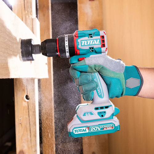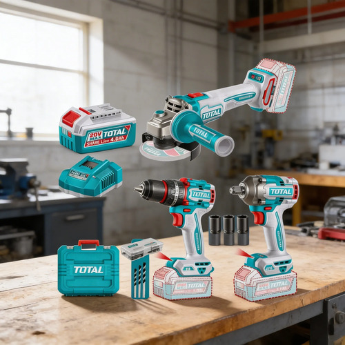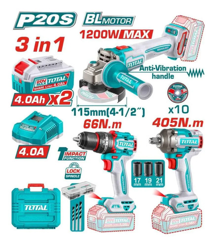COMBO TALADRO 20V 66NM + AMOLADORA 20V 1200W + LLAVE DE IMPACTO 405NM + 2 BATERIAS 4AH + CARGADOR RAPIDO + ACCESORIOS TOTAL TCKLI20358