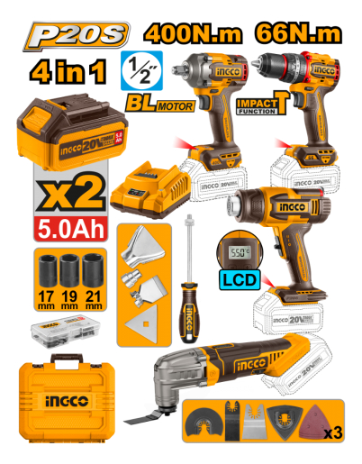 KIT COMBO A BATERIA P20S 20V C/ LLAVE DE IMPACTO + TALADRO ATORNILLADOR C/PERCUTOR + HERRAMIENTA MULTIFUNCION + PISTOLA DE CALOR C/ 2 BAT, CARGADOR, ACCESORIOS Y VALIJA