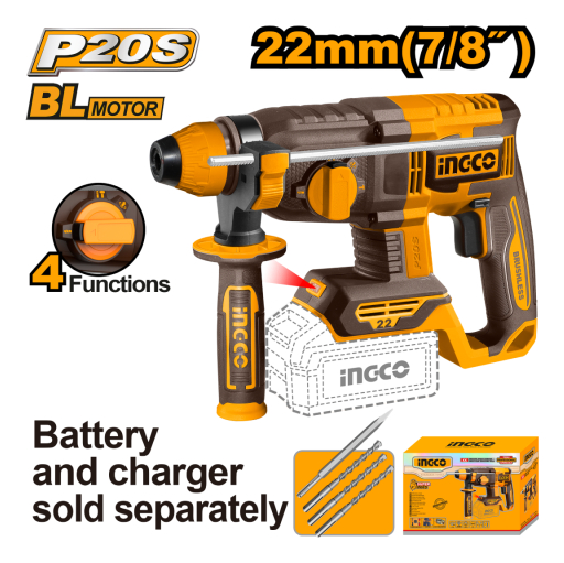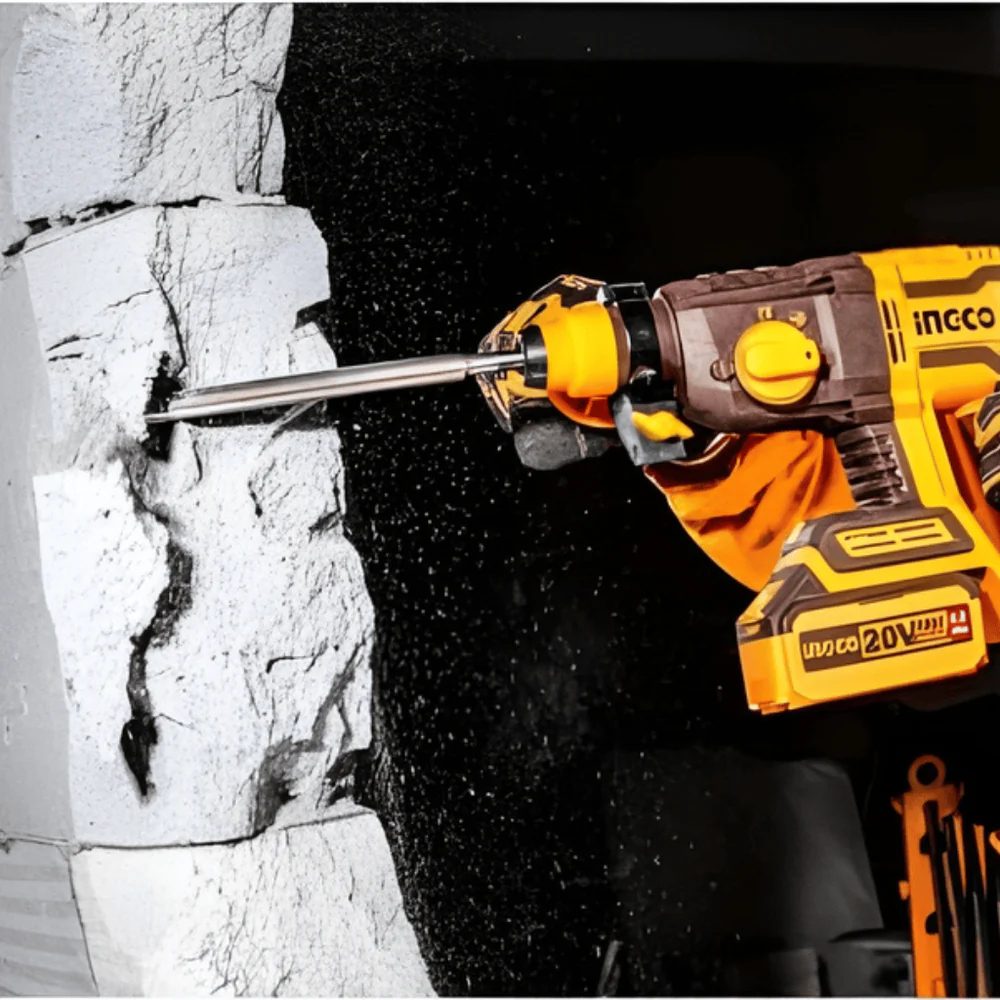 ROTOMARTILLO A BATERIA P20S 20V BRUSHLESS SDS PLUS 2.0J + 3 MECHAS + 1 CINCEL S/BAT Y SIN CARGADOR INGCO