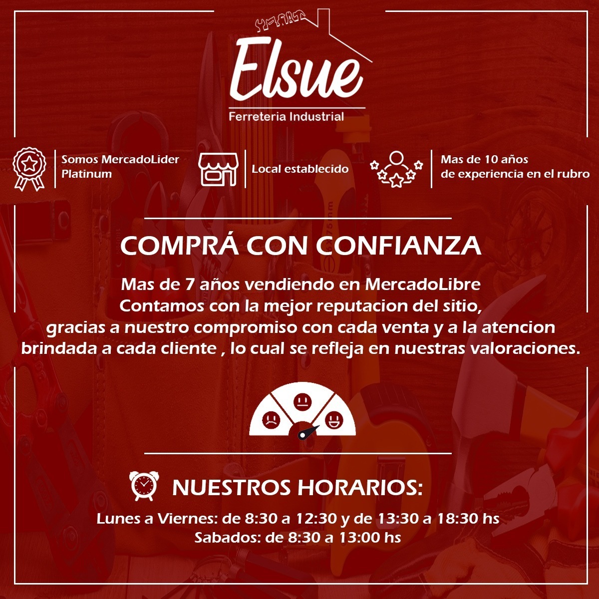 – Horarios de atención: Lunes a Viernes de 8:30 a 12:30 y de 13:30 a 18:30 horas, Sábados de 8:30 a 13:00.