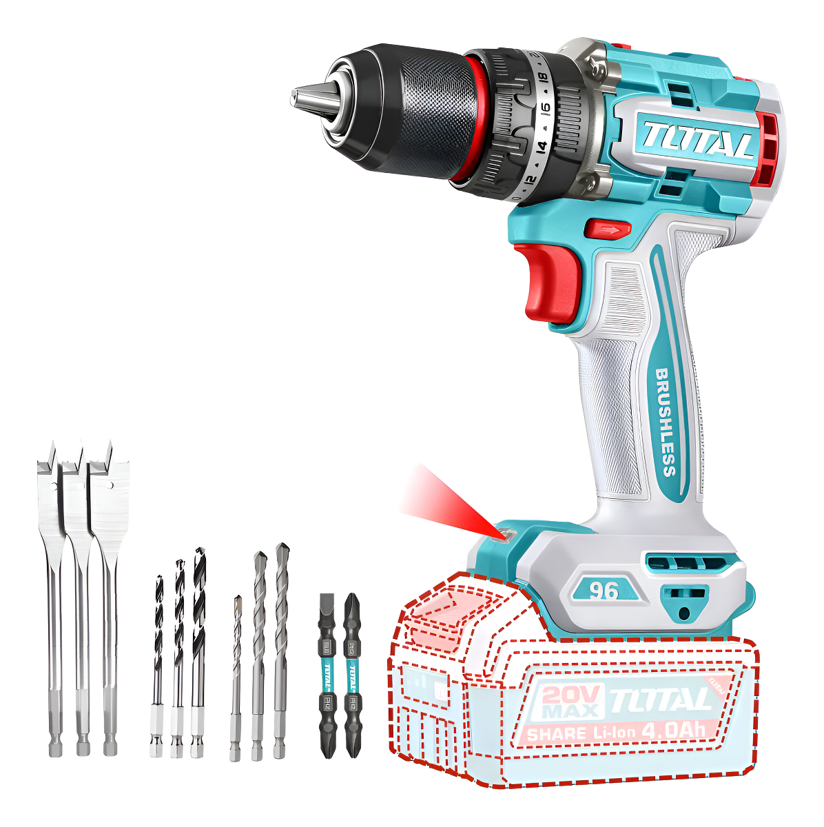 TALADRO ATORNILLADOR 20V TOTAL SIN CARBONES, CON ACCESORIOS INCLUIDOS TIDLI209681